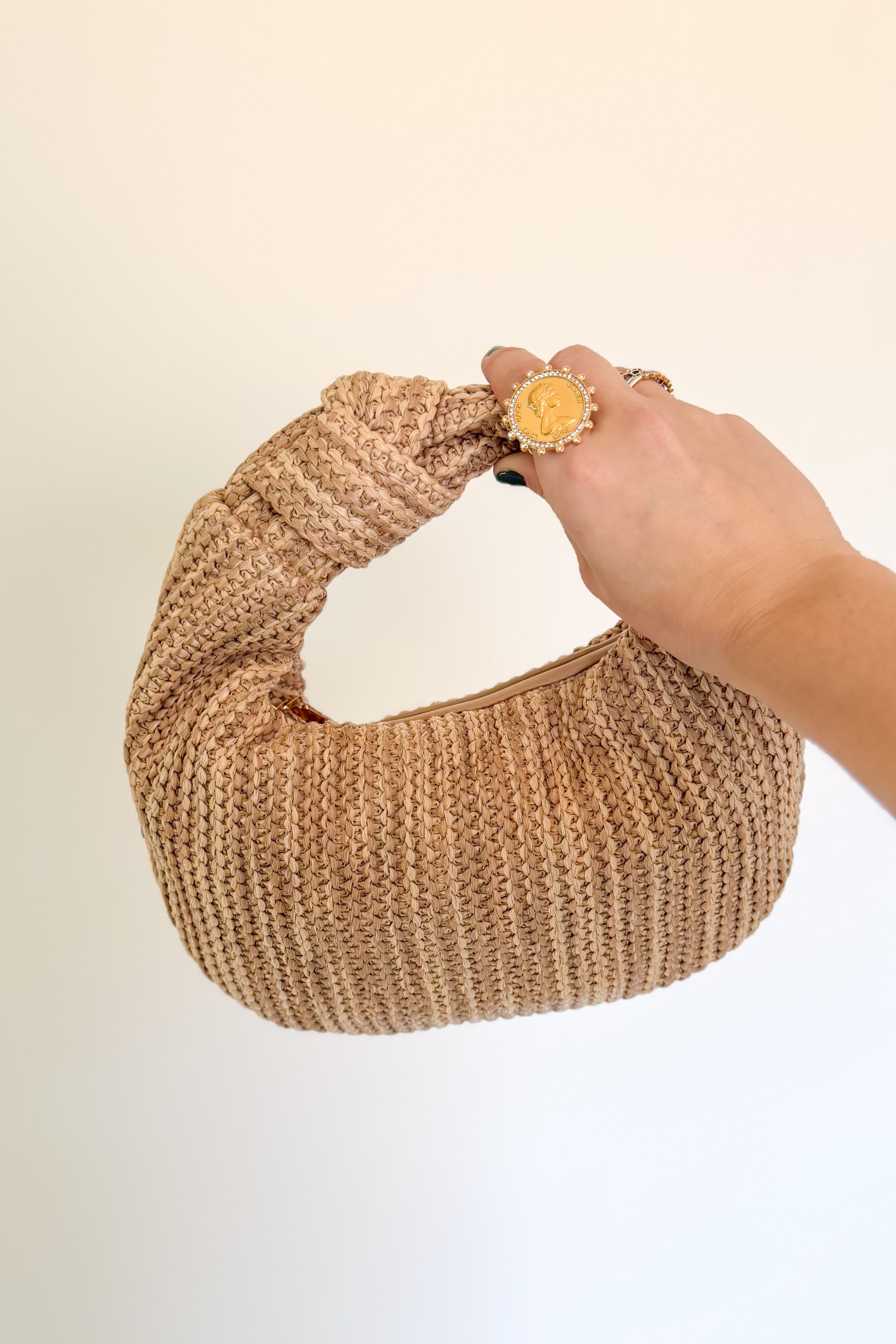 Tracy Hobo — knotted top-handle meets soft, woven hobo silhouette. Textured knit exterior, zip-top closure, roomy interior for wallet, phone, keys, makeup. Lightweight, slouchy shape sits comfortably in hand or crook of arm, perfect for day-to-night looks. Trend-aware detail and wearable proportions pair with tailored or relaxed outfits, a versatile handbag for style-conscious women seeking modern, functional accessories.