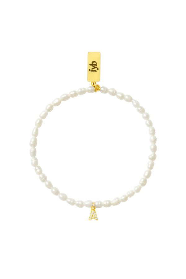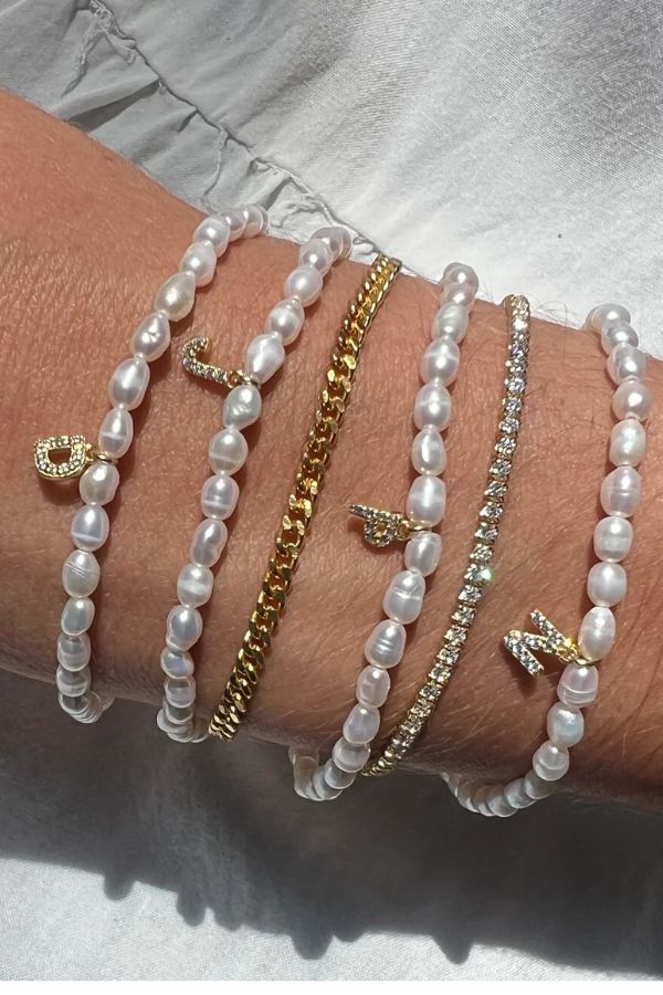 3mm freshwater pearl bracelet, 3A CZ 24k gold plated initial charm, 6.75" stretch to fit.
