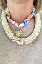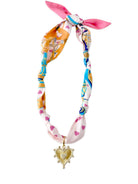 Soft, sweet, and effortlessly romantic — the Serenity Scarf Necklace features a dreamy pink and blue printed satin scarf adorned with subtle heart accents. At its center is a delicate 18K gold plated heart charm with sparkling CZ details, bringing a hint of elegance to this whimsical piece.