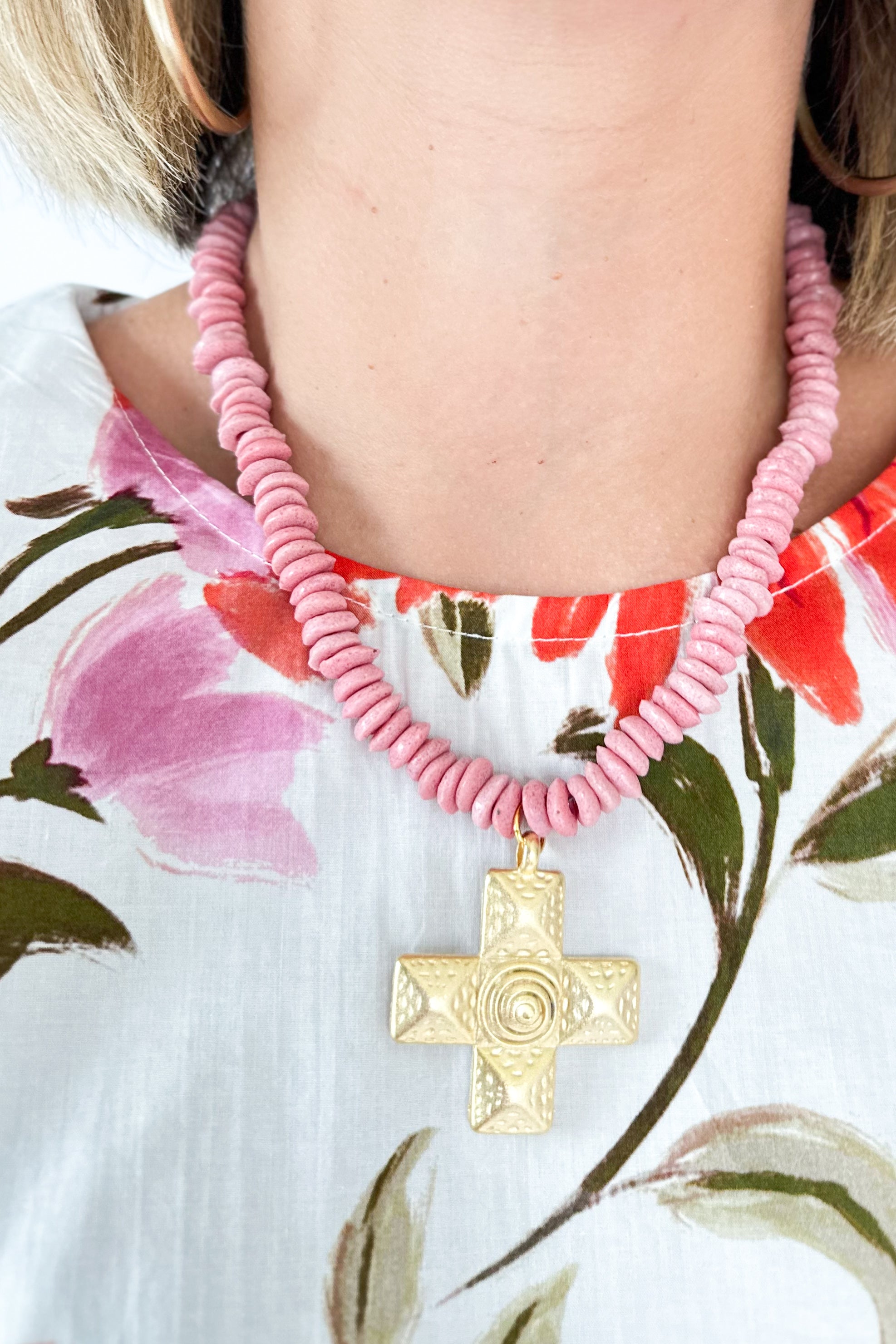 Disc Necklace with Cross | Pink